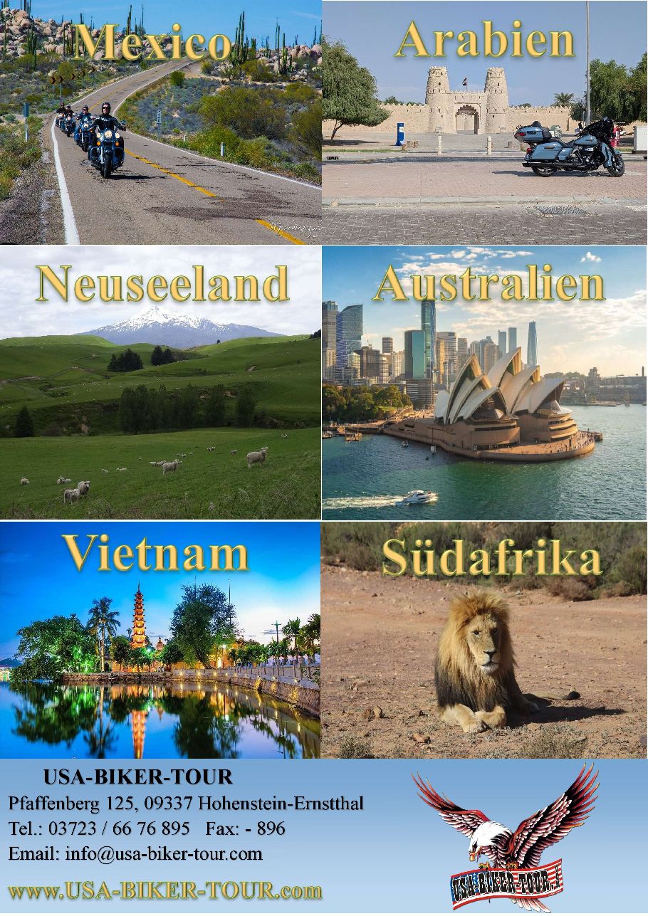 Außerhalb der USA haben wir tolle Landschaften zum Biken und Genießen in Mexico auf der Baja California und natürlich im Land der Kurven und der großen langen Wolke in Neuseeland gefunden und bieten auch dort unsere „Sorglos“-Reisen an, wie unsere Kunden ihr Erlebnis immer beschreiben.